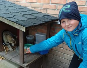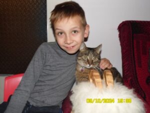 4 lata temu zauważyłem pod blokiem bezdomną kotkę. Była wychudzona. Błąkała się pod blokiem szukając jedzenia. Zacząłem ją dokarmiać wynosząc jej jedzenie. Początkowo uciekała ode mnie, ale po kilku miesiącach nabrała zaufania i już dała podejść blisko siebie, ale bez głaskania. Namawiałem rodziców, aby ją wziąć do domu. I tak przygarnęliśmy ją. Dzisiaj śpi leniwie na fotelach i wybiera lepsze karmy do jedzenia. Jestem jej właścicielem, bo w książeczce zdrowia są wpisane moje dane. Mamy też dokument adopcyjny tej kotki, niestety nie na mnie, ale na rodziców, bo trzeba było być pełnoletnim. Troska o moją Mimi to prawdziwa satysfakcja dla mnie.