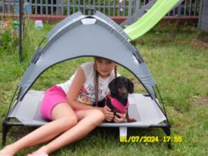 Od trzech lat pomagam babci w wychowaniu psa – jamnika. Często wychodzę z nim na plac zabaw, uczę go skoków przez przeszkody, pływania w basenie, skoków na psiej trampolinie. Sprawia mi to wielką radość. Nawet jeżdżę z nim na pokazy – PSIEMARSZ do Łukowa, gdzie moje lekcje skutkują zajęciem I, II lub III miejsca w różnych konkurencjach.