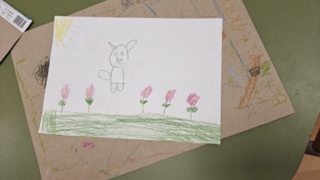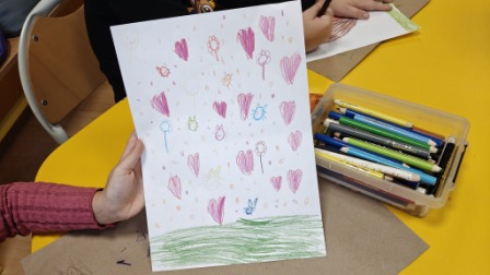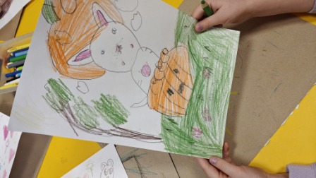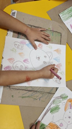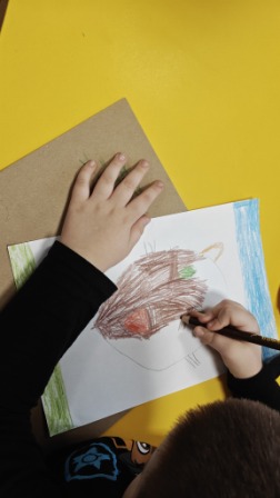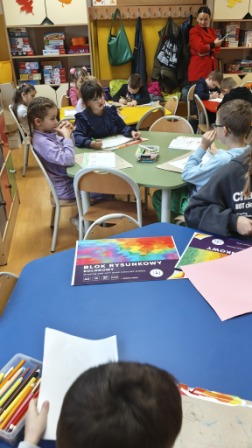 Następnie dzieci usiadły przy stolikach i rozpoczęły rysowanie portretów Cukierka, czyli kota – głównego bohatera opowieści. Wszystkie prace były pełne kreatywności i kolorów. Autorzy najładniejszych portretów Cukierka zostali nagrodzeni koronami.