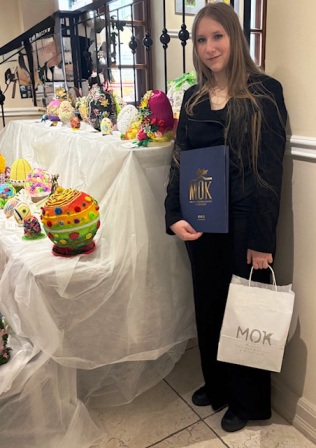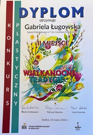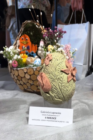 Jest nam bardzo miło przekazać wiadomość, że uczennica Gabrysia Ługowska z kl. 8b zajęła II miejsce w konkursie plastycznym: „Wielkanocne Tradycje” organizowanym przez Miejski Ośrodek Kultury w Siedlcach. Uczennica wykonała piękną pisankę z gliny a komisja konkursowa podkreśliła w jej pracy: technikę wykonania, formę przestrzenną, estetykę, zabawę fakturą, trójwymiarowość. Gratulujemy Gabrysi kolejnego już w tym roku sukcesu plastycznego i życzymy dalszego rozwoju zdolności artystycznych.