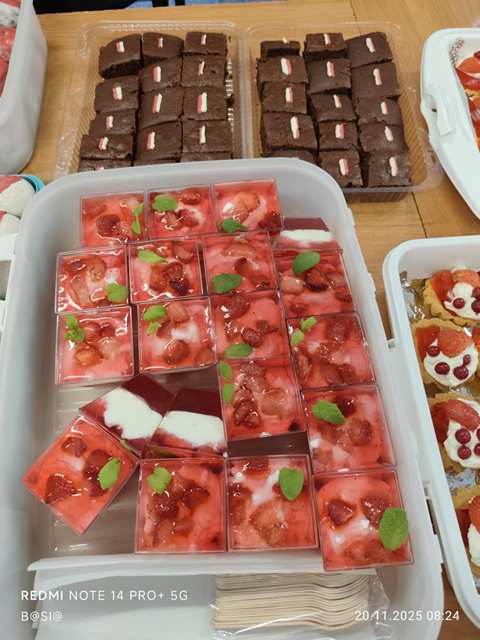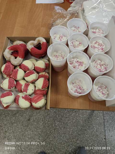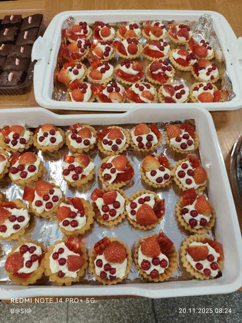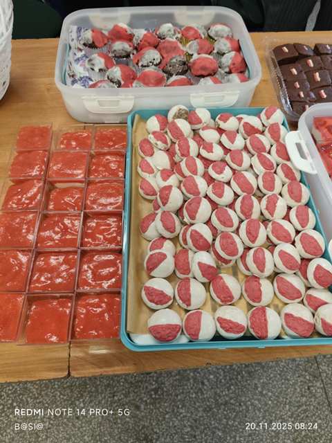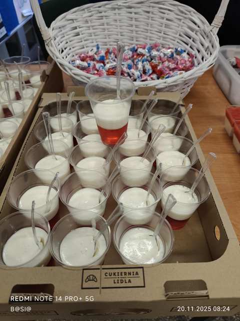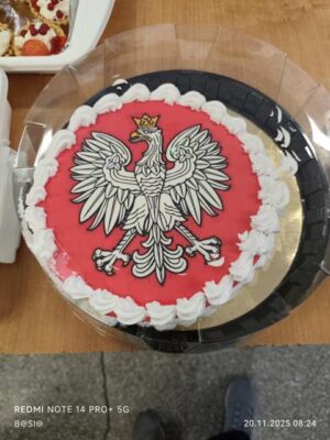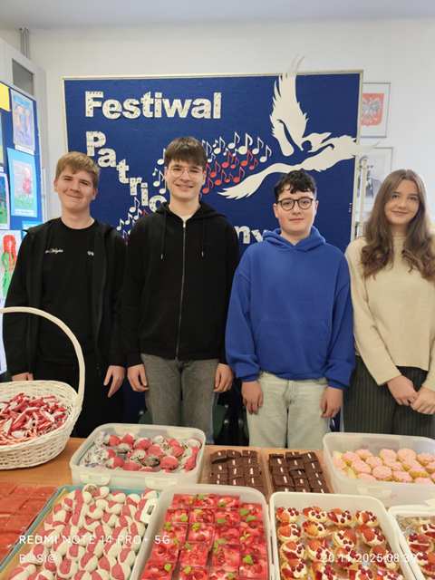 Co to się działo, oj, co się działo!!! 20 listopada 2025 r. uczniowie koła historycznego częstowali słodyczami uczniów naszej szkoły. Co było? Wszystko: przepiękny tort z godłem, bezowe lizaki, zwykłe lizaki, cukierki, pianki, szaszłyczki, serniczki na zimno, pierniczki, ciastka, ciasta, babeczki, wafelki i wiele innych słodkości. Cóż w tym dziwnego? Wszystko tylko wyłącznie w barwach narodowych! A te wszystkie smakowitości otrzymaliśmy od naszych wspaniałych Rodziców, którzy bardzo chętnie włączyli się do akcji „Święto Niepodległości na słodko w barwach biało-czerwonych”. Bardzo dziękujemy wszystkim Rodzicom i liczymy, że za rok znowu się spotkamy przy biało-czerwonym stole!!!