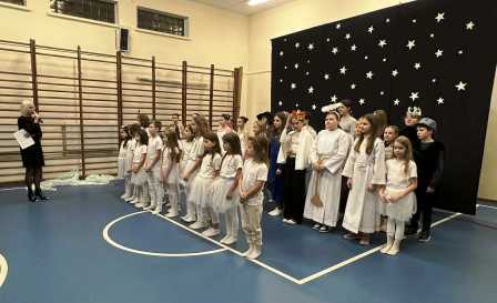 Również nauczyciele i pracownicy szkoły co roku uczestniczą w Wieczorze Wigilijnym, aby na chwilę zatrzymać się w tym zabieganym świecie. Taki wieczór odbył się w naszej szkole w dniu 17 grudnia 2025 roku. Aby umilić ten czas uczniowie pod kierunkiem p. Małgorzaty Matuszewskiej i p. Małgorzaty Serzyckiej zaprezentowali część artystyczną. Zebrani pracownicy szkoły, goście i rodzice mogli obejrzeć Boże Narodzenie w nieco innej formie niż tradycyjne jasełka.
